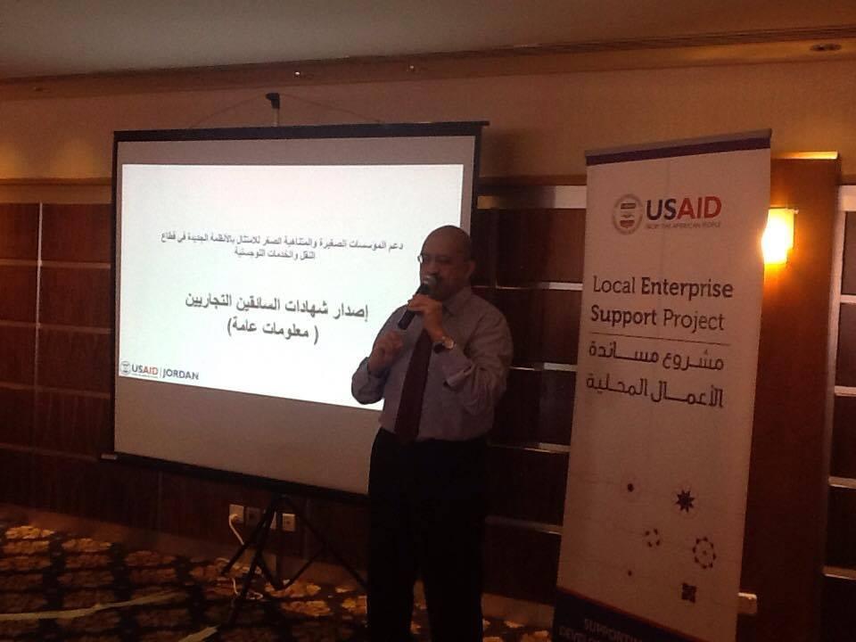 تعقد هيئة تنظيم النقل البري بالتعاون مع مشروع مساندة الأعمال المحلية المموّل من الوكالة الأمريكية للتنمية الدولية ثلاث ورش تدريب مدربين في مجالات معايير السلامة والمهنية الدولية تحت إطار مشروع "دعم الشركات الصغيرة ومتناهية الصغر في قطاع النقل البري".